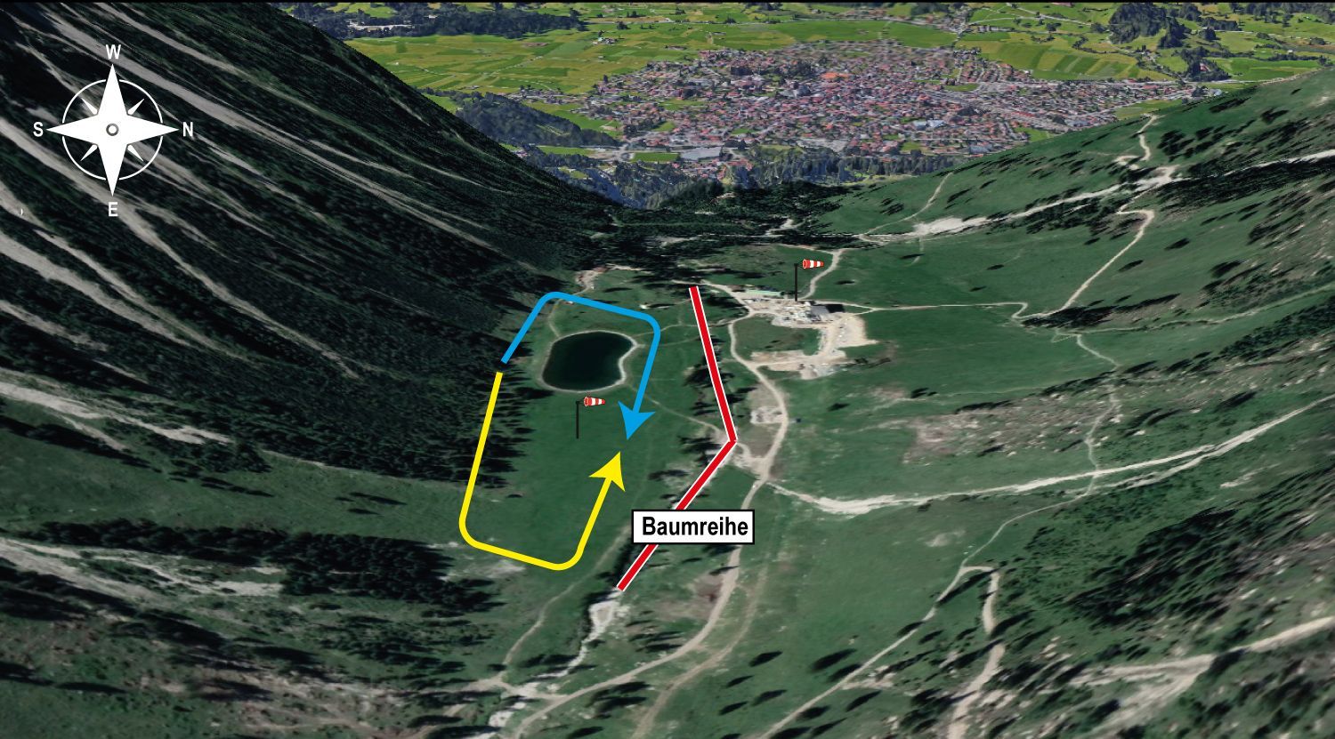 - Keine Landungen nördlich der Baumreihe oder auf Skipisten